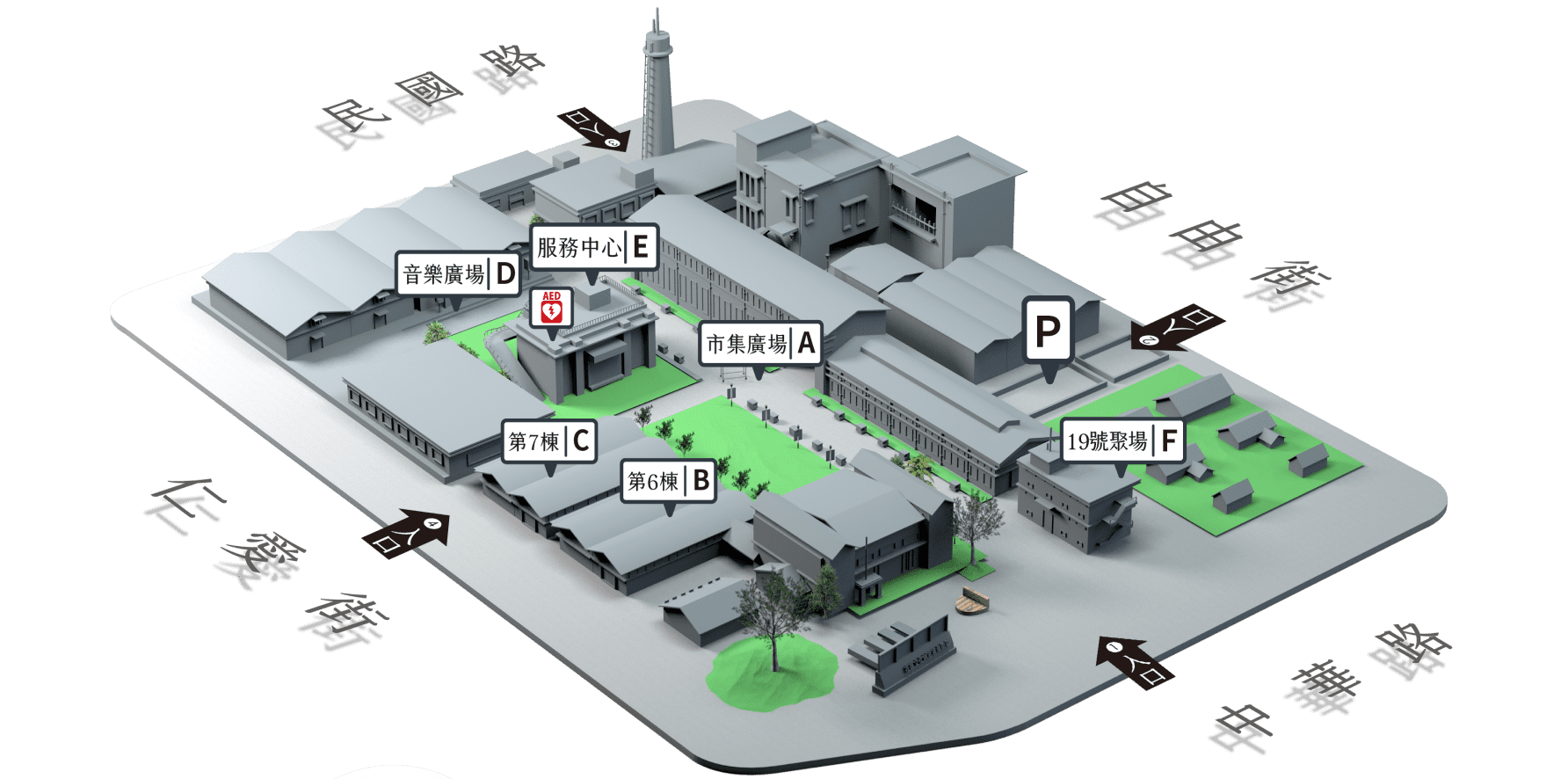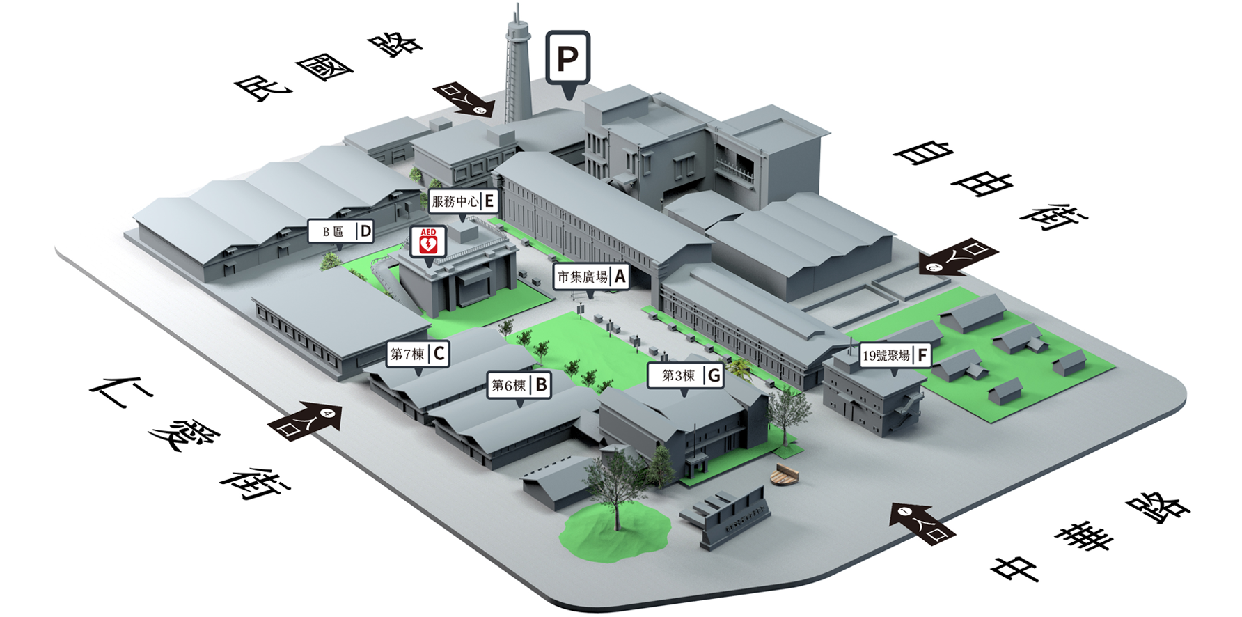 - 園區緊鄰自由街停車場,提供215格收費停車位,每小時20元。
